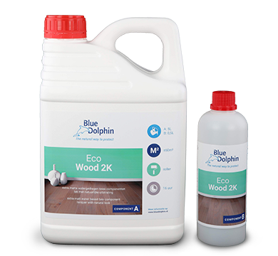 Eco Wood 2K extra mat is een twee componenten polyurethaan lak op waterbasis met een extra matte, natuurlijke hout uitstraling. Door het gebruik van speciale harsen geeft deze lak het (eiken) houten oppervlak een uiterst matte en natuurlijke uitstraling. Eco Wood 2K heeft uitstekende fysische/chemische eigenschappen en is geschikt voor zowel projectmatig als huishoudelijk gebruik. Verwerk Eco Wood 2K rechtstreeks op het hout in drie lagen voor de ‘onbehandelde look’ uitstraling. Ook te gebruiken i.c.m. alle Blue Dolphin grondlakken, zoals de Eco Starter, Super Basic 2K en Super Intense 2K. Daarnaast is deze ‘natural look’ lak ook toepasbaar als lakafwerking over de lichtere tinten van de One Coat 2K Oil. Bij verwerking van de Eco Wood 2K lak over BD One Coat 2K Oil is het belangrijk het geoliede oppervlak eerst min. 30 uur te laten drogen met voldoende ventilatie, voordat de lak aangebracht wordt.