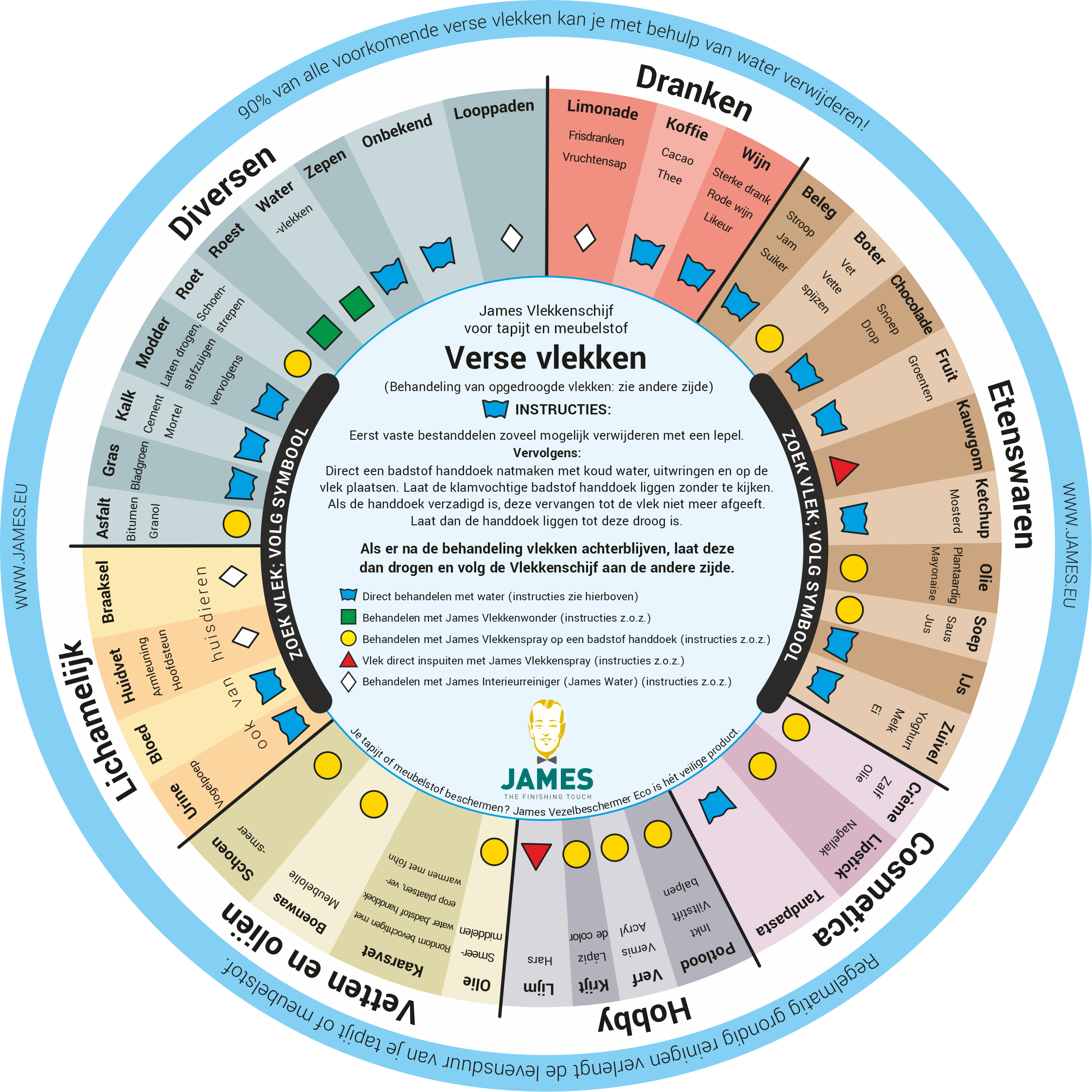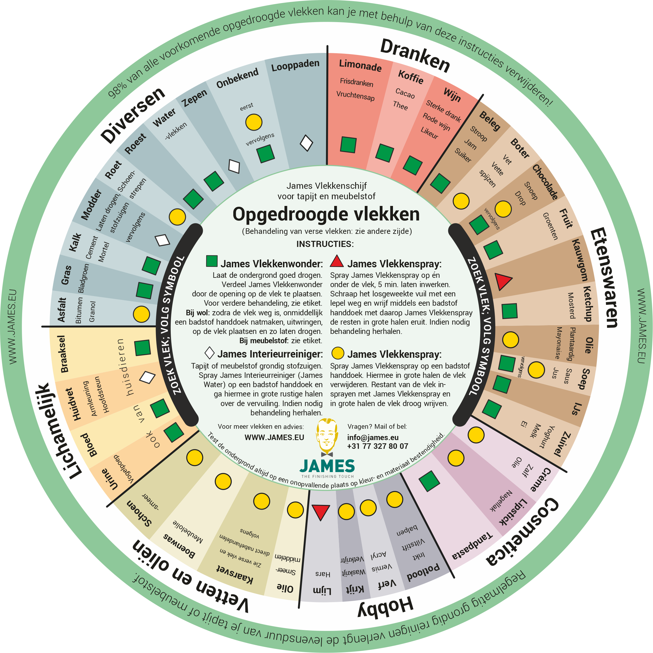 De James Vlekkenschijf is een praktische gids voor het snel en correct verwijderen van vlekken uit tapijt en meubelstof. Het is geen reinigingsmiddel, maar een hulpmiddel dat je stap voor stap vertelt welk product je nodig hebt en wat je moet doen bij een specifieke vlek. De schijf is compact, duidelijk en ontworpen om direct te gebruiken op het moment dat er iets misgaat.